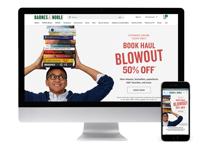 The Barnes & Noble Bookhaul Blowout is a dual channel promotion where hundreds of new releases are sold at 50% Off. The success of this campaign in 2018 motivated leadership to make this a biennial event, crediting the playful and lighthearted photography, animations, and typography as the drivers to increased online engagement and surpassed dotcom sales goals.